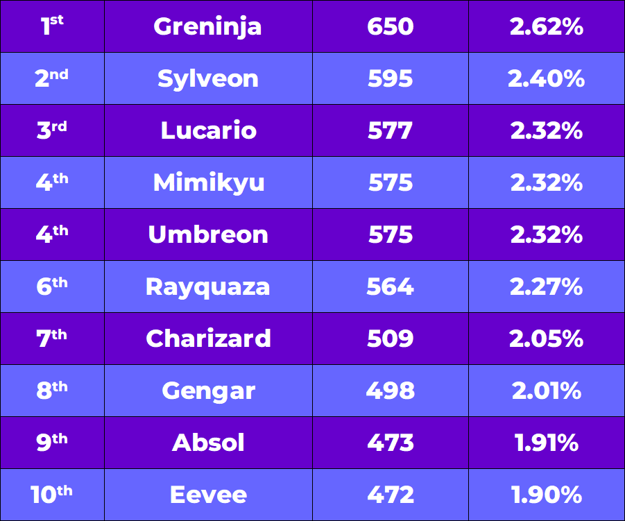 The Johto Times Favourite Pokémon Poll 2025 top ten results, showing Greninja as the winner with 650 votes