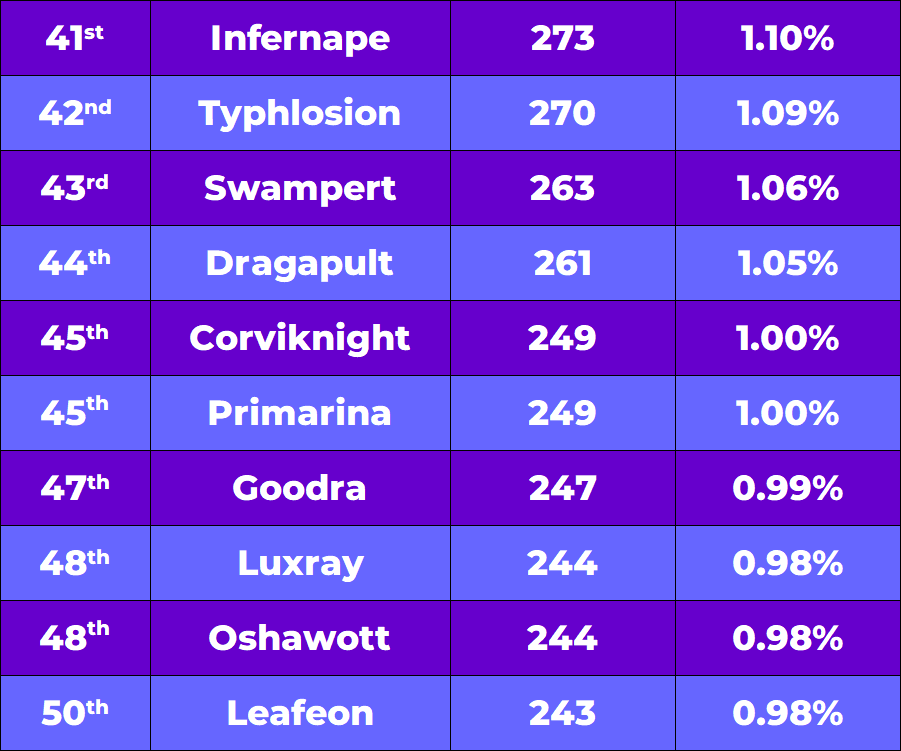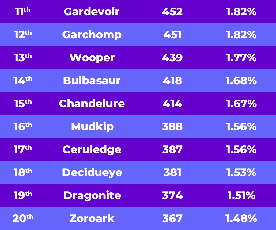 Please note: unlike the preliminary poll, we decided to acknowledge jointly held positions. For example, 4th and 5th place were a tie, so we gave both Pokémon a 4th place position, which we didn’t do for the preliminary polls. Because there were no ties in the top ten of each poll during these preliminary rounds, it didn’t impact the Grand Final.