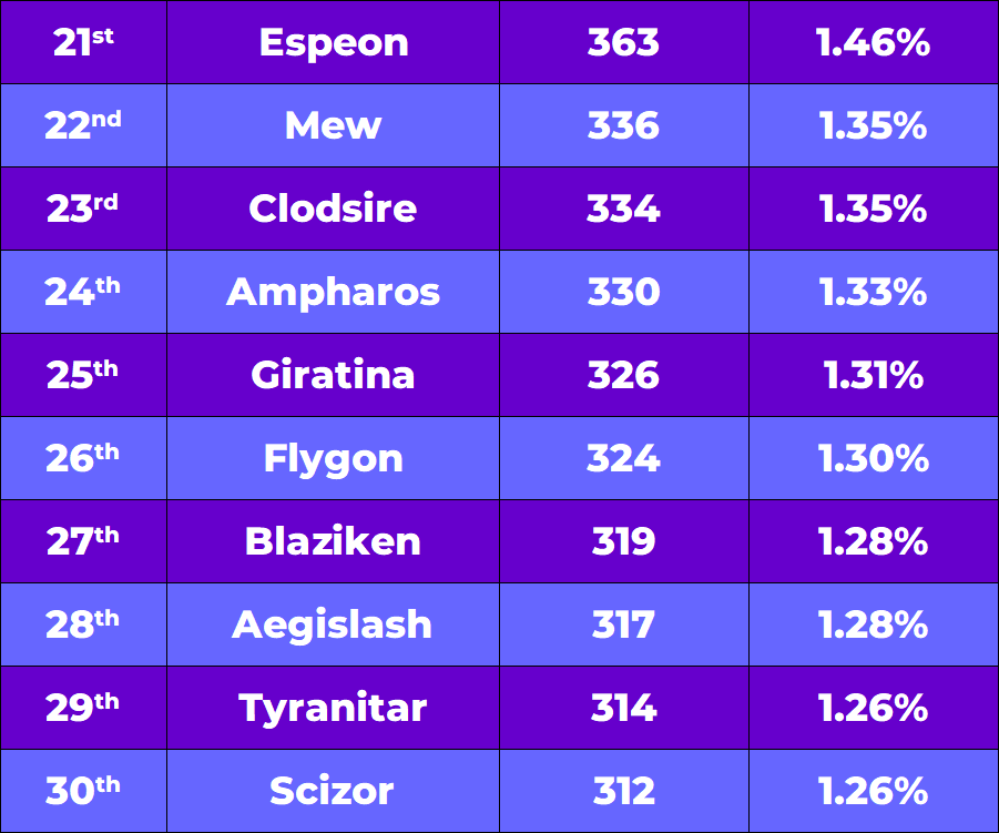 Here are the placements of all ninety Pokémon, their rank, and total number of votes