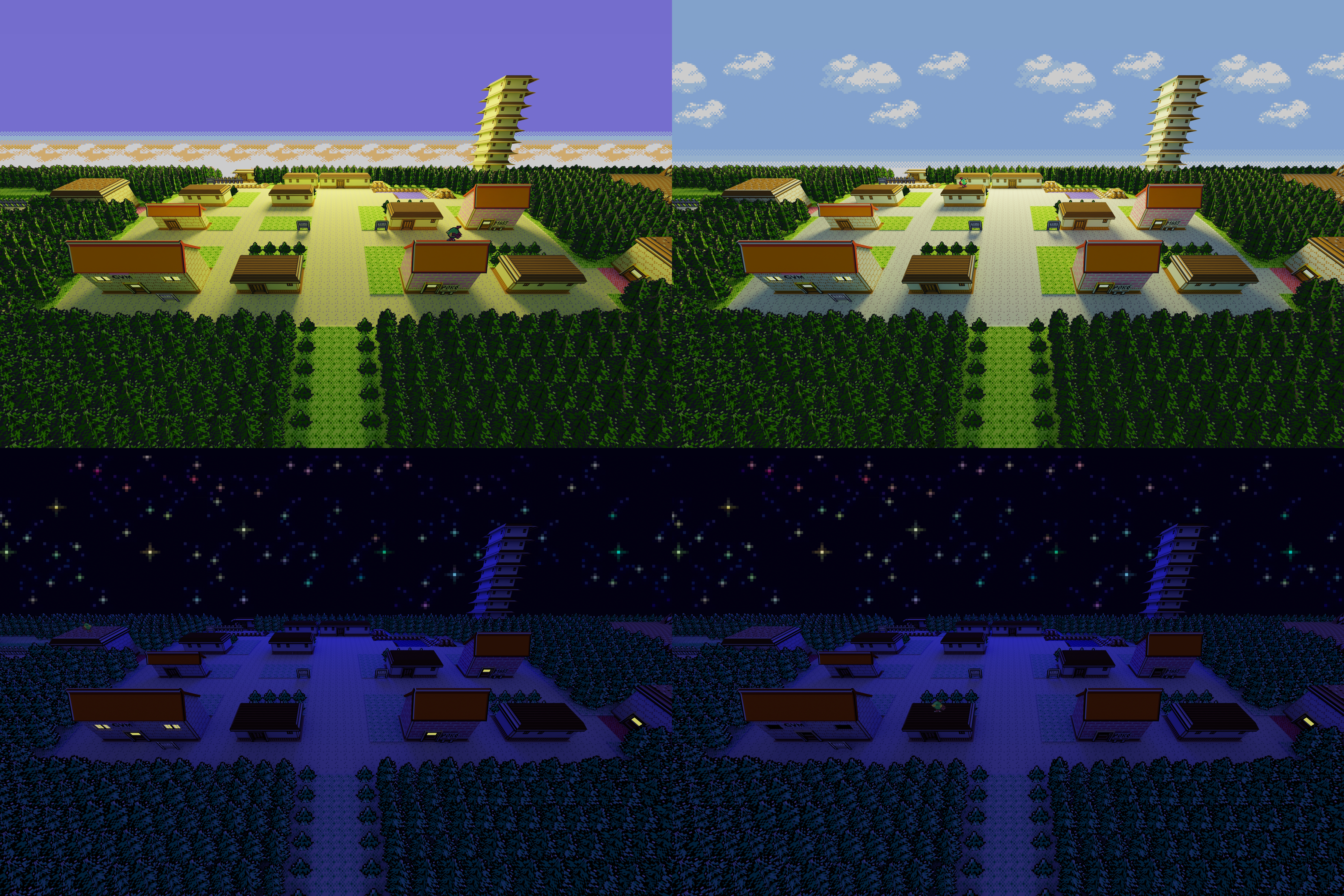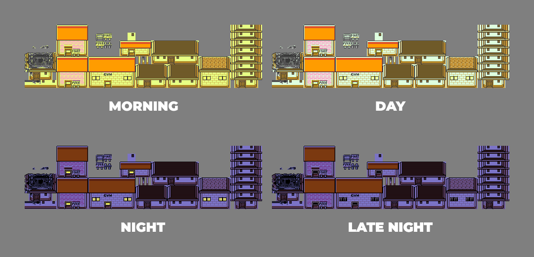 Each of the banners, displaying a different scene (Morning, Day, Night, Late Night) which display depending on the visitor’s local time. We used the same day and night cycle as Pokémon Crystal