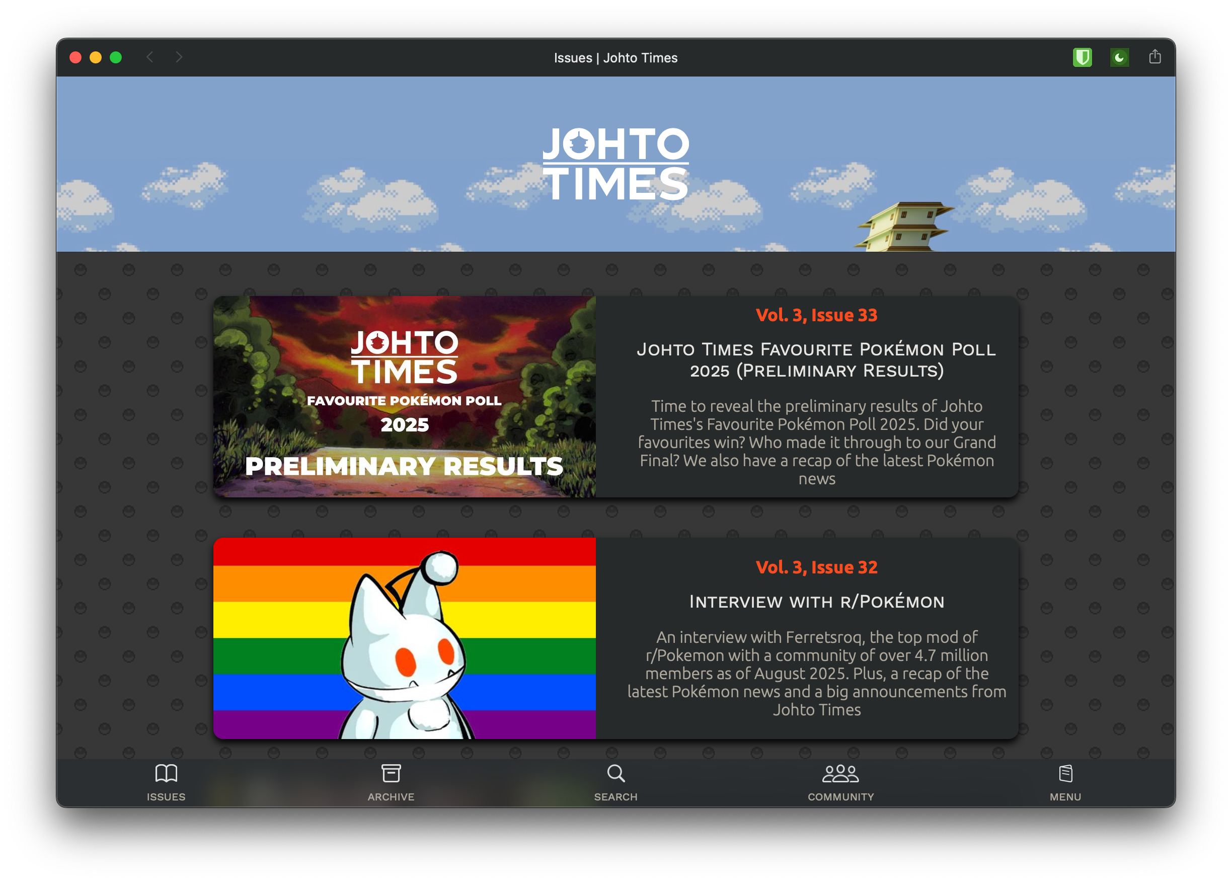 Hi! I’m Renan and I’m a Brazilian software engineer based in Italy. I’ve known you for a long time and have followed some of your other crazy projects, but Johto Times is the one in which I got the most involved. I started helping out with proofreading the issues, but since 2024 I’ve been working on the development of the website itself!