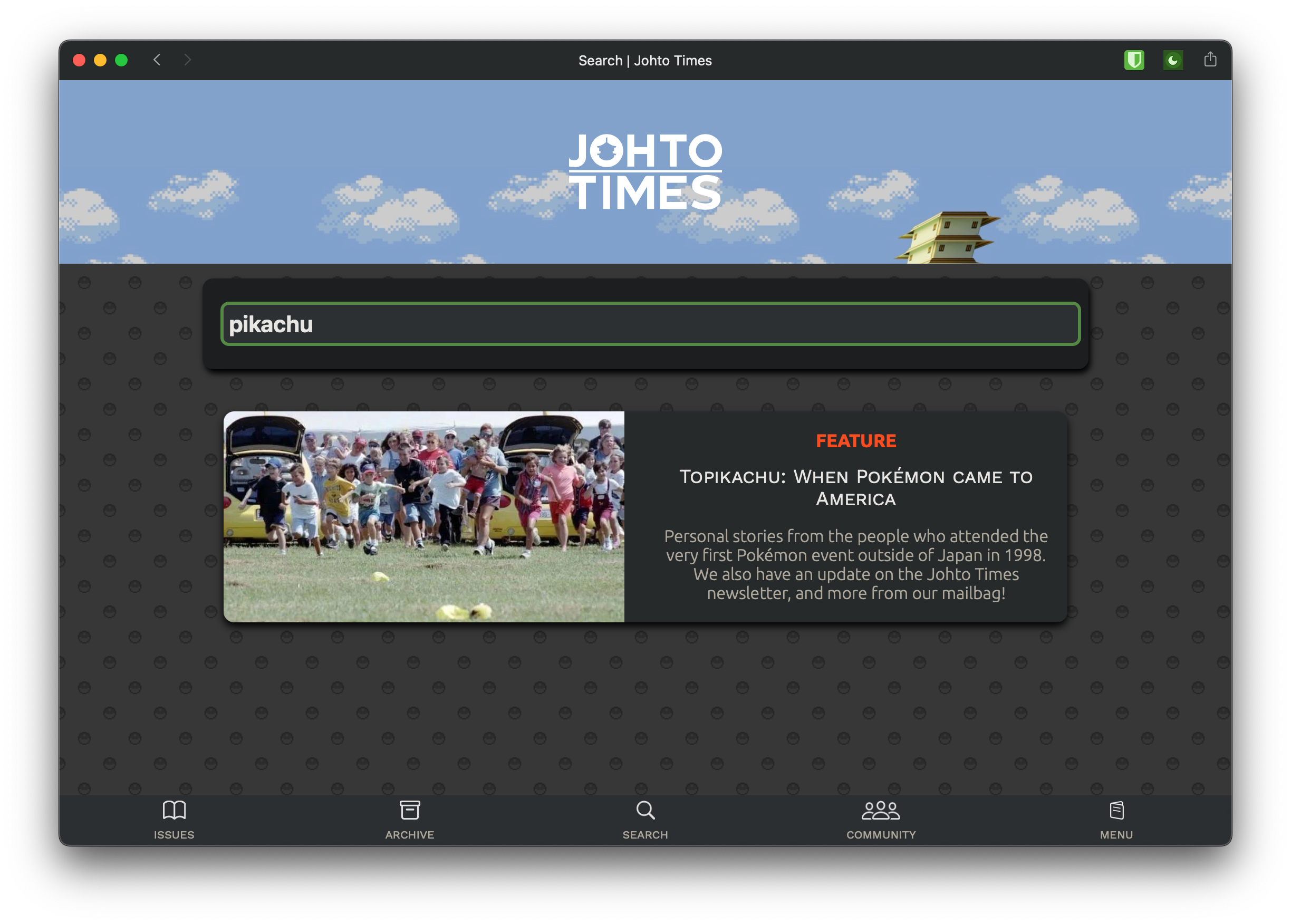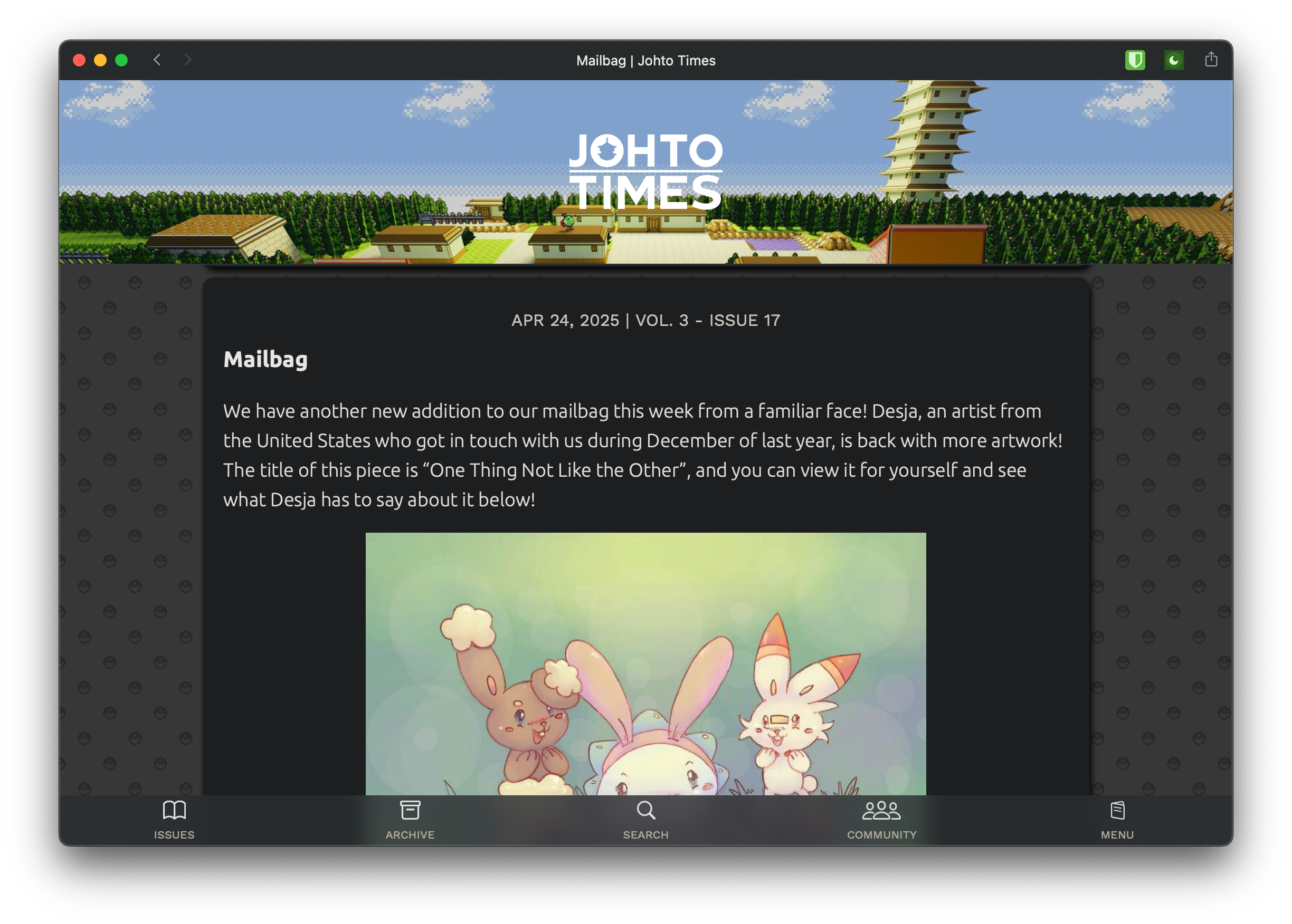 Johto Times issues have a unique and standard structure: intro, news, main feature, and mailbag. We wanted to preserve the issue-based cadence while also making the individual pieces of content standalone, like in the scrolling feed of mailbag messages from readers
