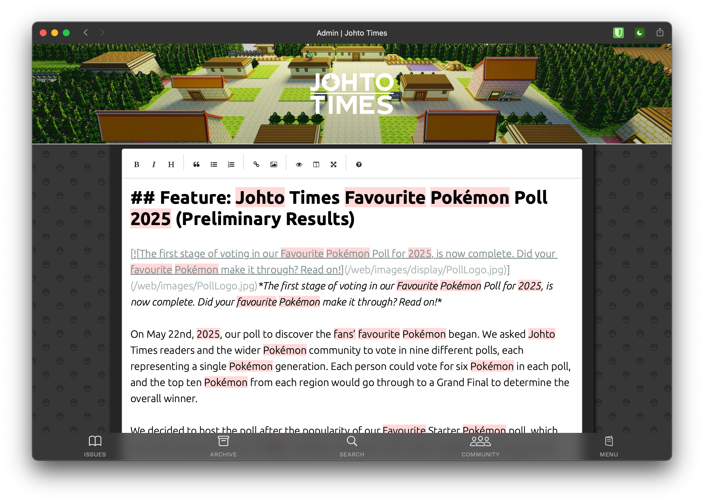 That said, the editor itself is built upon an open-source JavaScript library, which I plugged into our interface. One thing that is unique about Johto Times is the division of content into issues, which contain different sections such as the news items and the mailbag, so that was all worked on based on the open-source components. But our readers won’t need to worry about it; the editor is just for you.