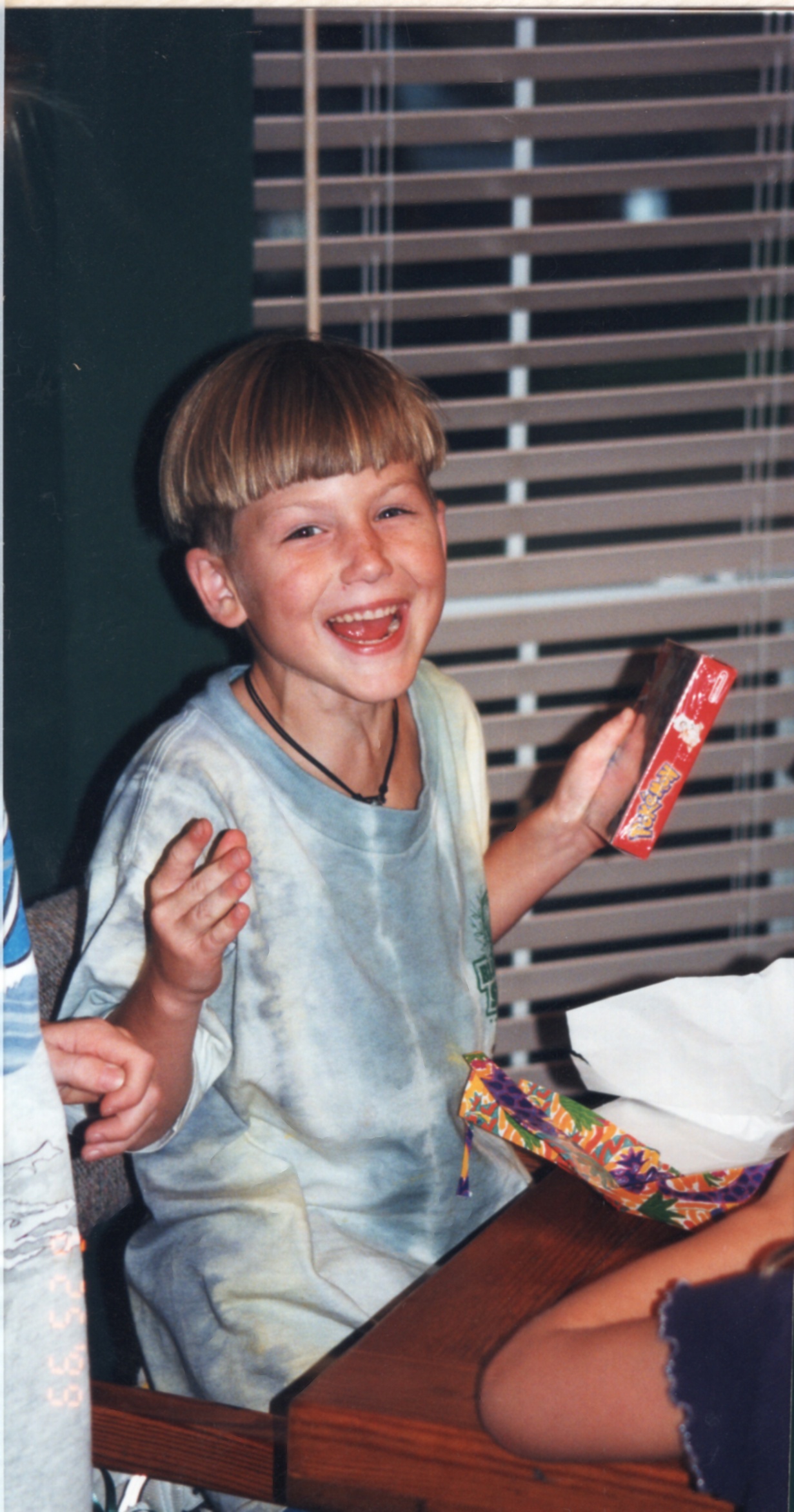 A photograph of Michael taken by his father on his seventh birthday as he opened up his gift of Pokémon Red