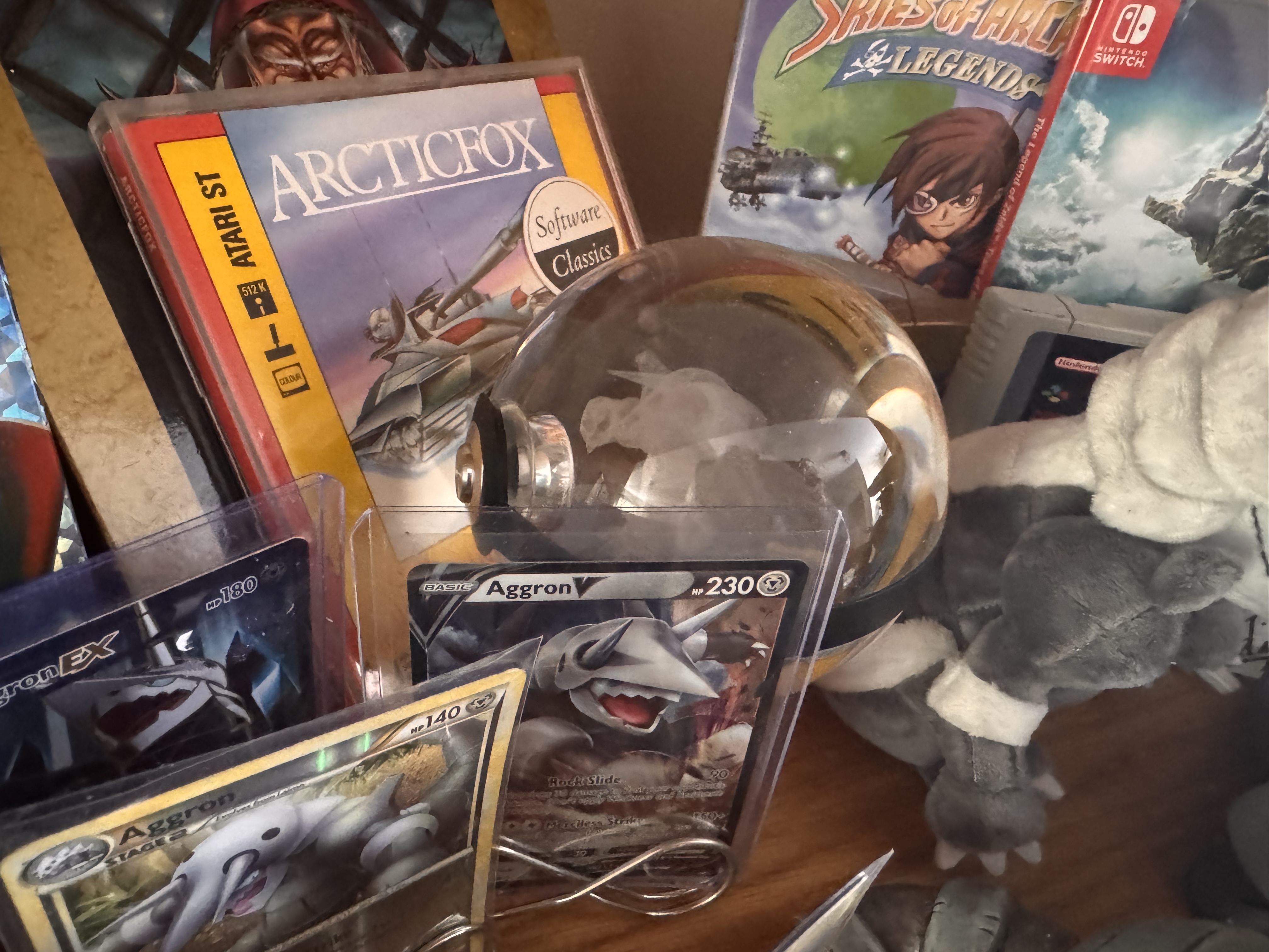 A photograph of Jon’s Aggron collection, which contains trading cards, figures, plushies, and moreA photograph of Jon’s Aggron collection, which contains trading cards, figures, plushies, and more