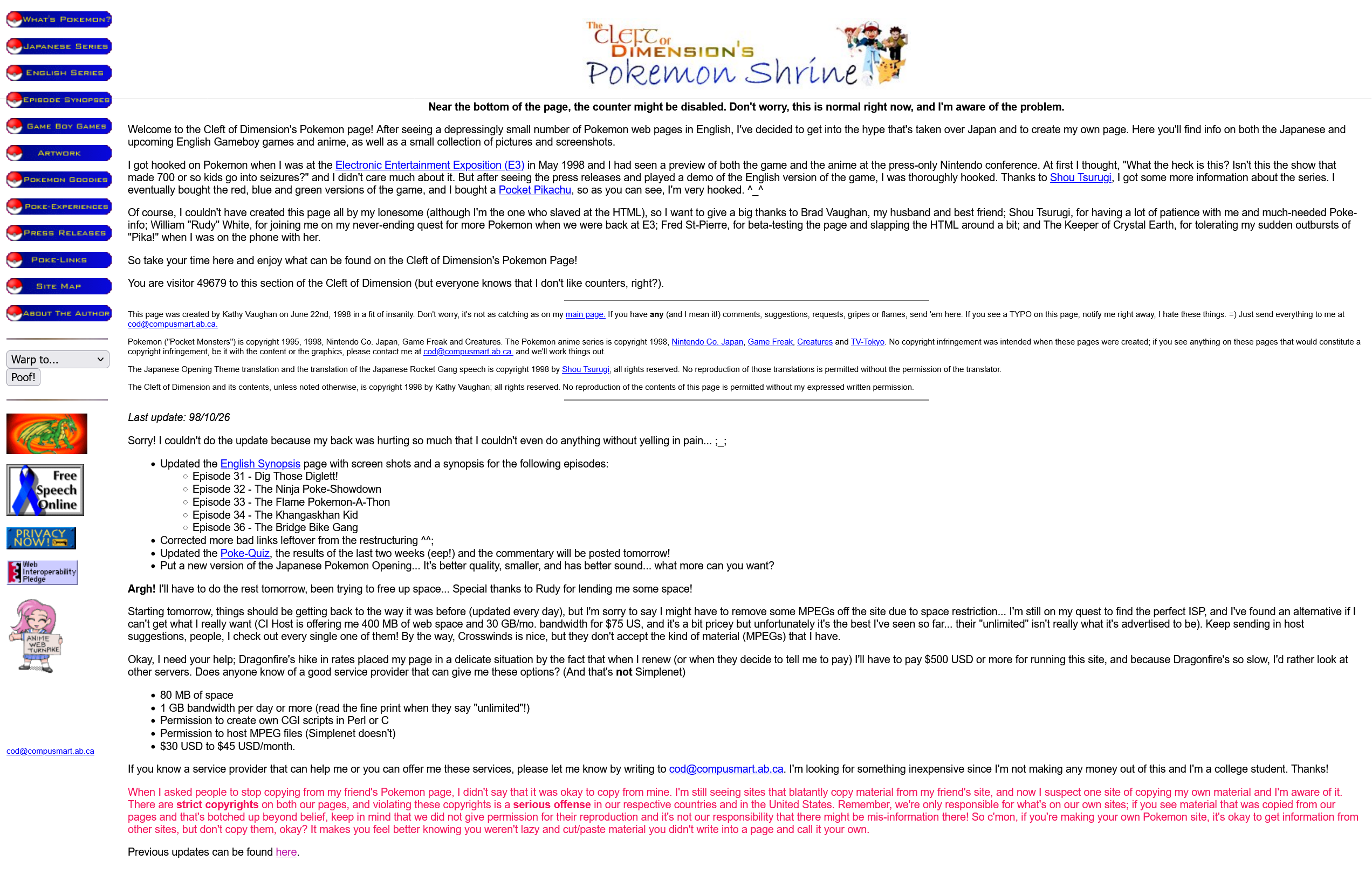 In August 1998, North America was about to be introduced to Pokémon for the first time. Despite Pocket Monsters being incredibly popular in Japan from early 1996, the localisation of the franchise had yet to launch. The Cleft of Dimensions Pokémon Shrine was one of the very earliest Pokémon fansites which offered information and resources to inform the earliest English-speaking Pokémon fans to understand what the franchise was all about.