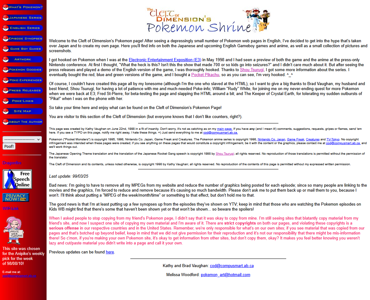 The Cleft of Dimensions Pokémon Shrine soft launched on June 22nd, 1998, and was updated frequently from August that year, making it one of the earliest English Pokémon fansites. What encouraged you to create the website in the first place?